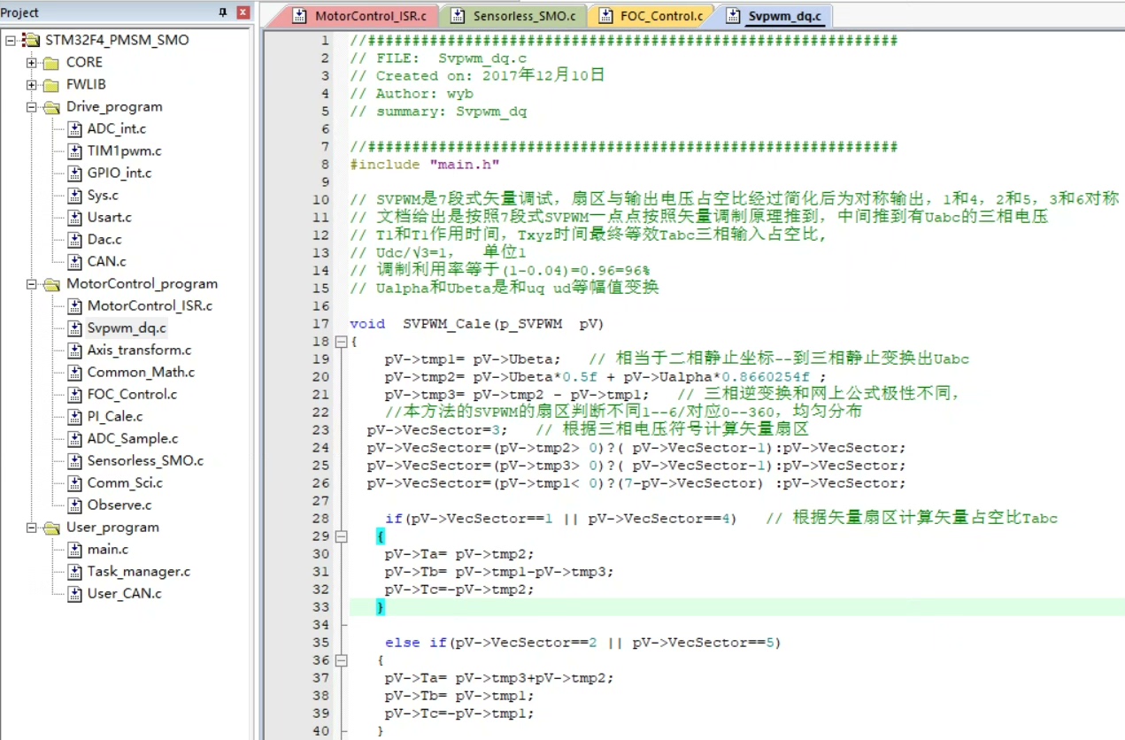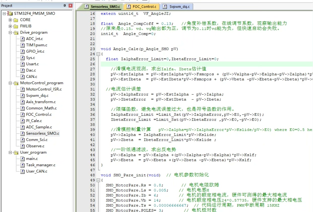 这个就很贴心了,是基于 STM32F405/407 平台的代码。原本采用 VF 启动 + smo 方案,然后在这个框架上移植了 VESC 的无感非线性观测器代码,最厉害的是能实现 0 速启动。咱们来看一段移植后可能关键的初始化代码: